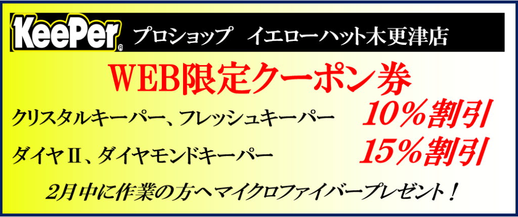 WEB限定クーポン券 2026.01.042026.02.12 *イエローハット木更津店でのみ使用可能です。受付時にご提示ください。 期間限定クーポン3/1まで 各種ボディーコーティング割引 純水洗車+アンダーコートセット ・WEBクーポン画面を受付時にご提示ください。 洗車割引券 ・WEBクーポン画面を受付時にご提示ください。